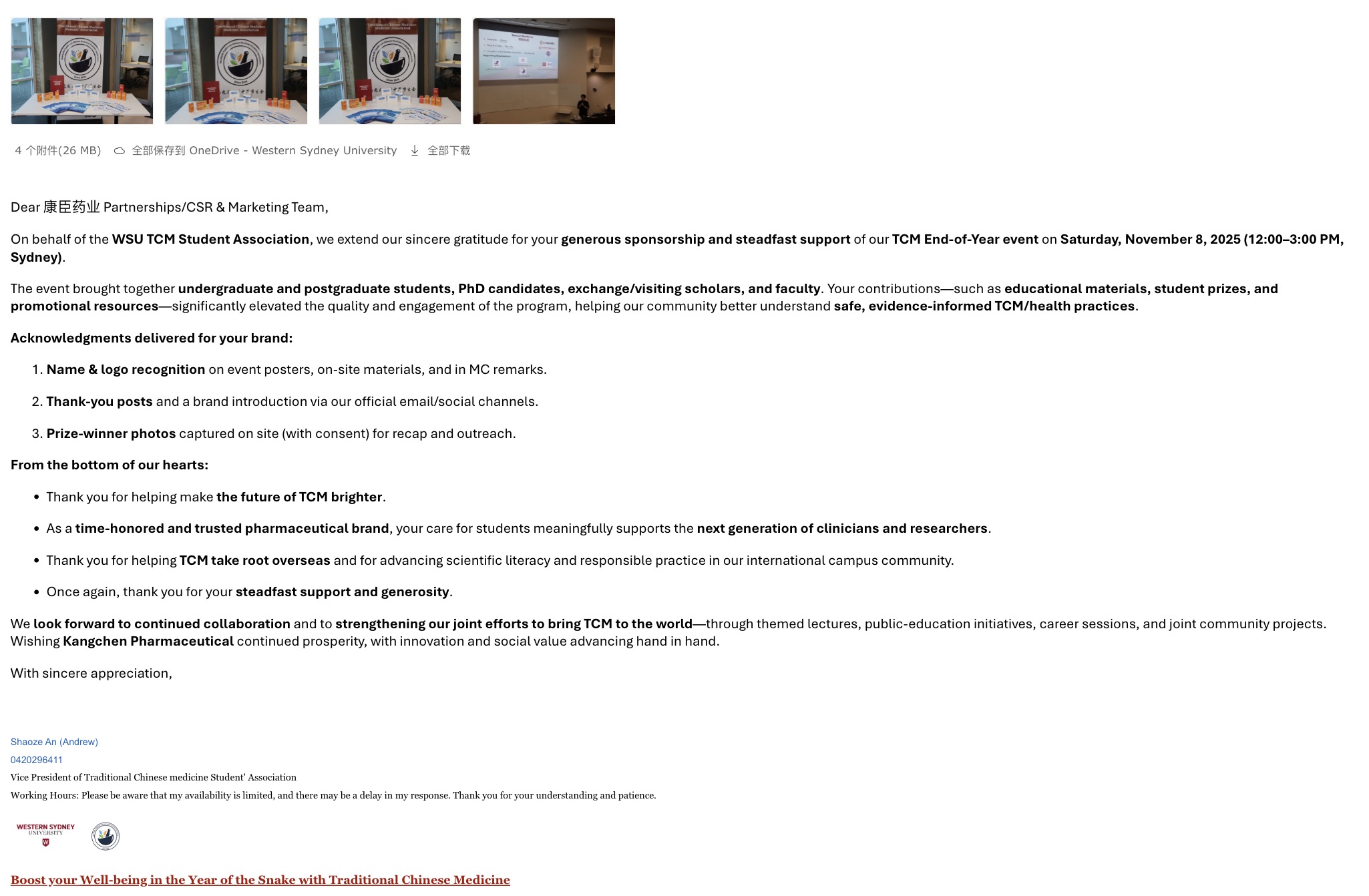 三、康臣药业收到来自澳大利亚悉尼高校中医学生会的感谢信,信中诚挚感谢企业对海外中医药教育与青年人才培养的大力支持。