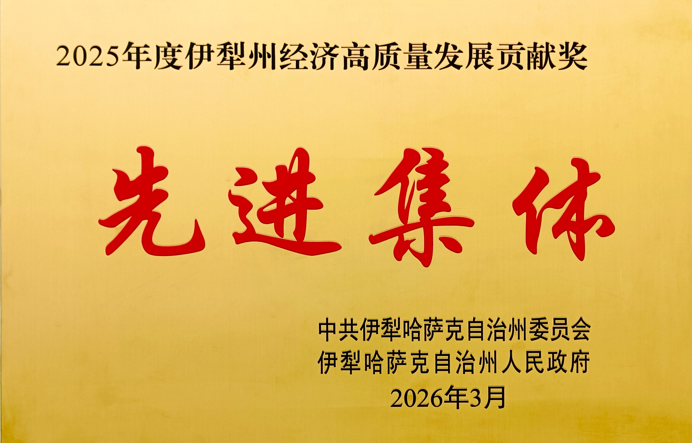 ▲ 图 | 2025年度伊犁州经济高质量发展贡献奖先进集体牌匾