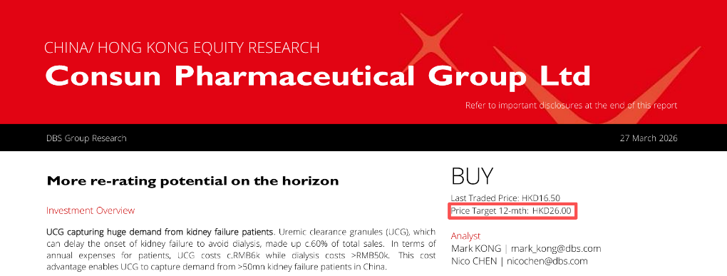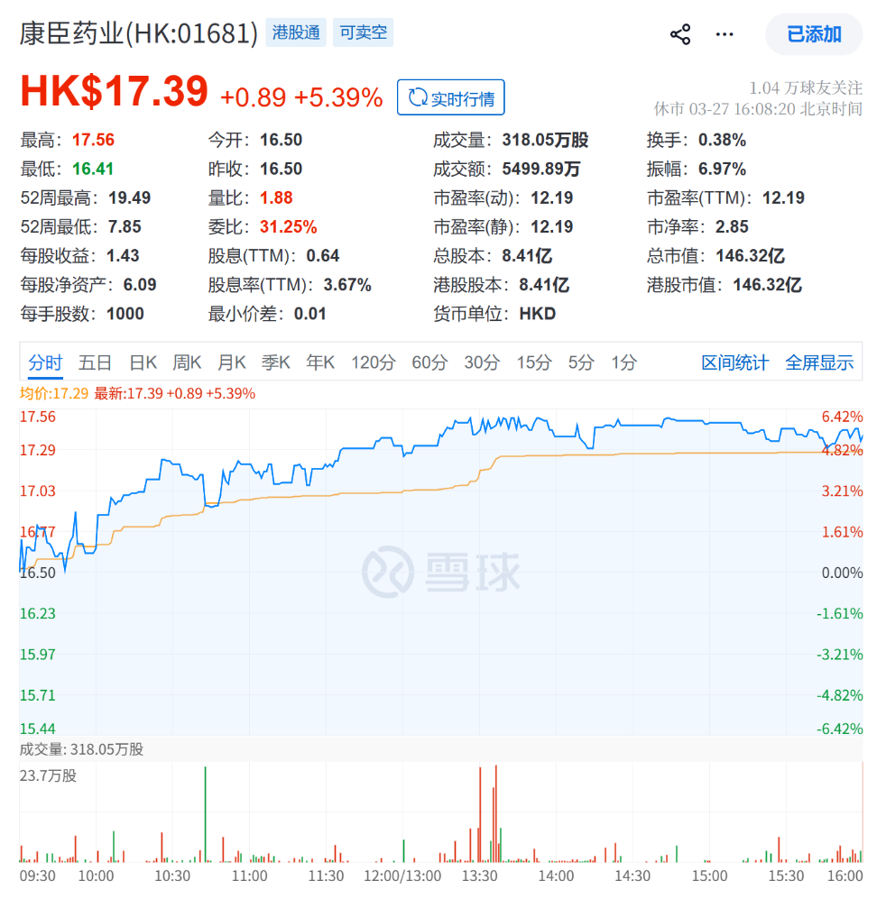 公司的稳健业绩与高效沟通获得了市场的积极反馈。长期跟踪康臣药业的星展银行(DBS)于3月27日发布研报,给予公司“买入”评级,目标价26港元。在业绩利好与积极市场情绪的推动下,公司股价在发布会后首个交易日(3月27日)放量上涨,收盘报17.39港元,单日涨幅达5.39%,显著跑赢大市,充分显示了投资者对其投资价值的认可。