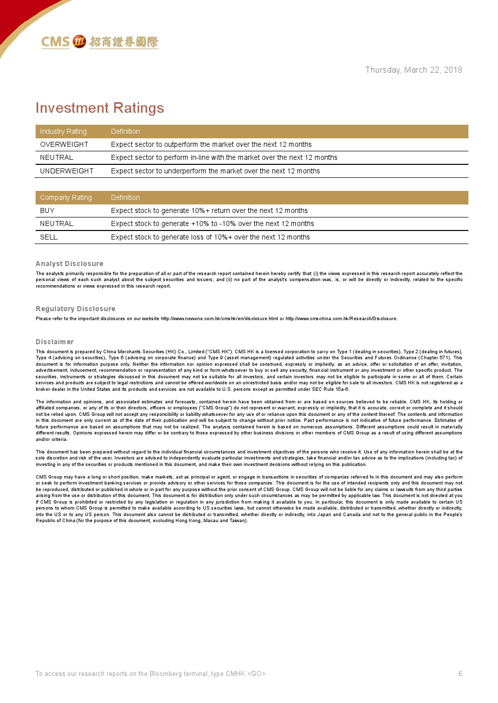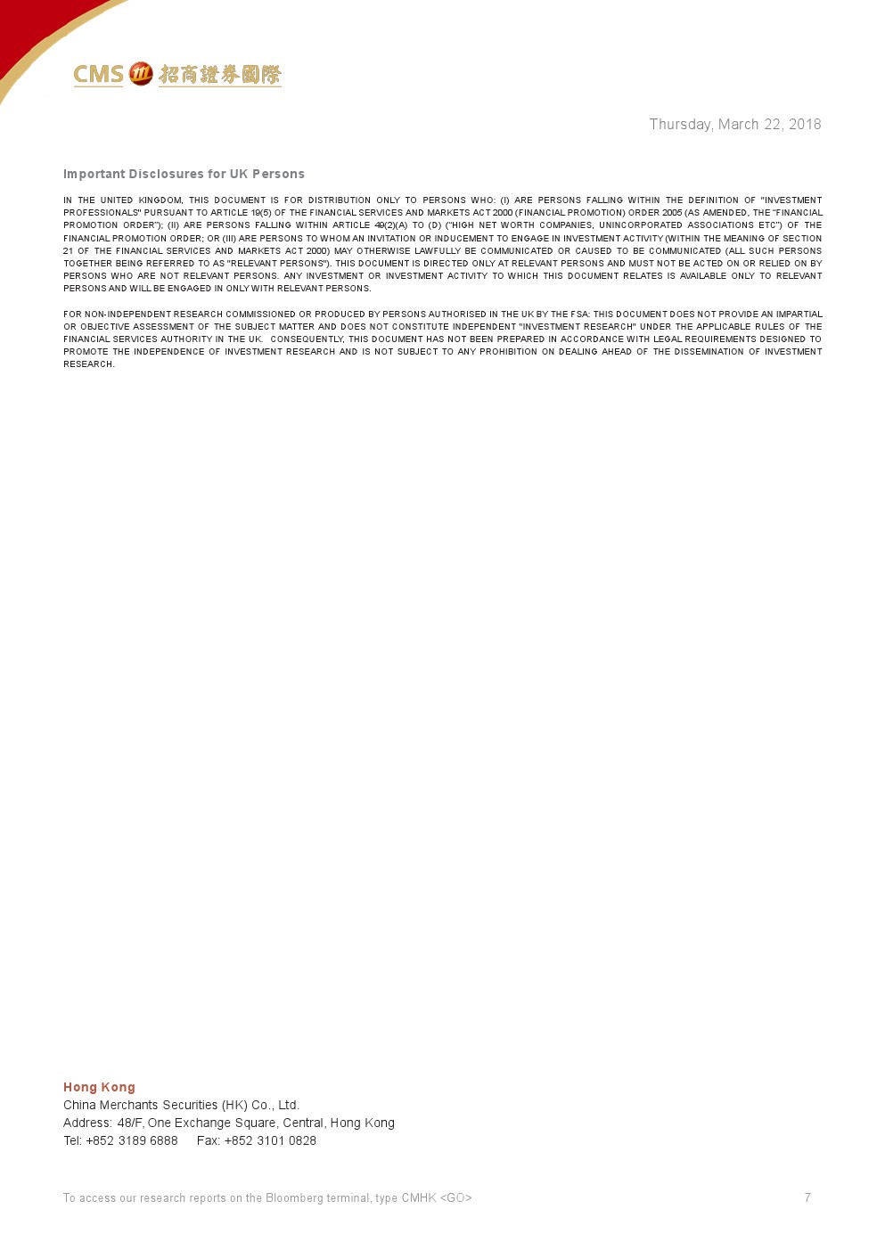 3)招商证券国际SOTP估值模型对公司外延收购给予20%估值溢价,考虑人民币对港币升值影响,提高公司目标价至11.95港币,对应2018年18倍市盈率,维持买入评级;