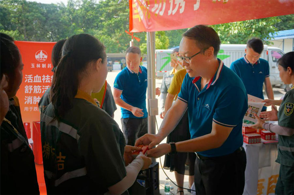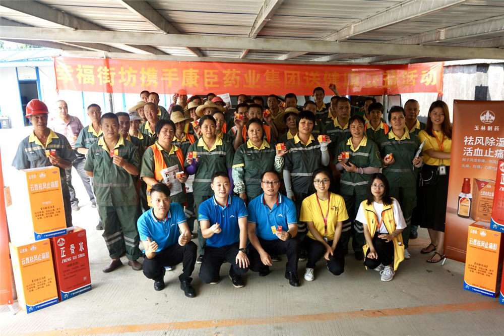 9月10日,康臣益行社的社员们来到广州黄埔区云埔街环卫站,向500多位环卫工人捐赠“玉林”牌正骨水、云香祛风止痛酊,为美化城市默默奉献的“城市美容师”送去健康。
