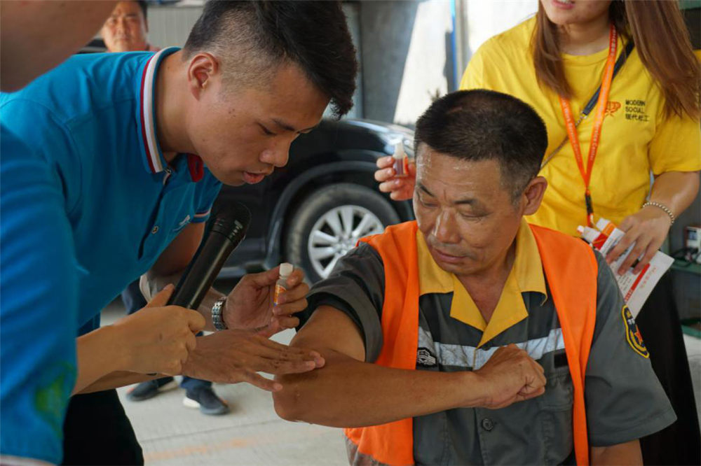 在药品捐赠现场,一位肘部肿痛的环卫工人还体验了“云骨疗法”,来自OTC市场部的曹旺一边演示一边讲解步骤和手法,以便让药品发挥更好的效果。