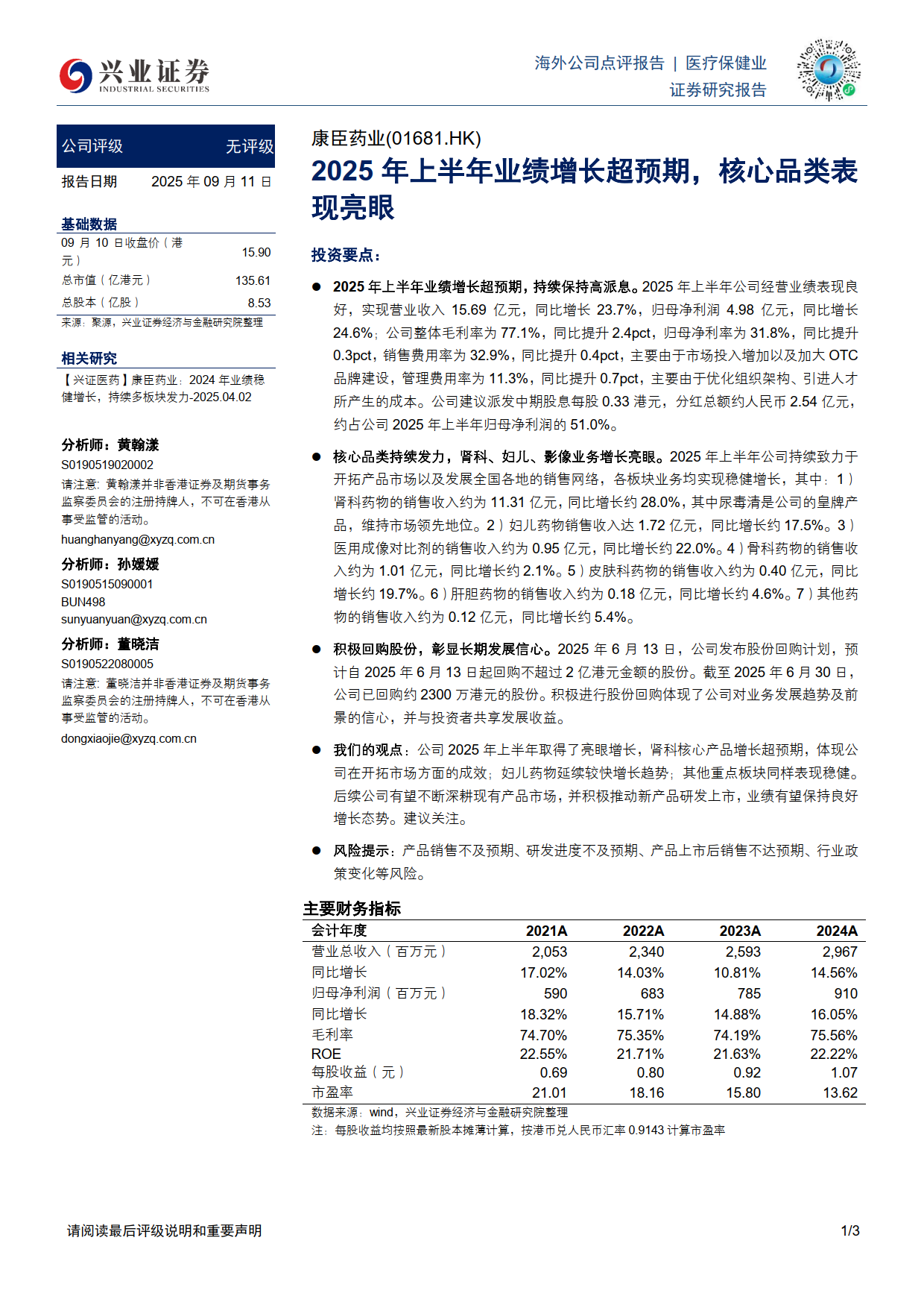 兴业证券-康臣药业1681:2025年上半年业绩增长超预期,核心品类表现亮眼