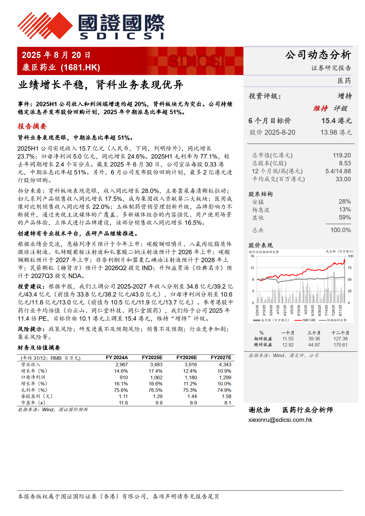 国证国际-康臣药业1681:业绩增长平稳,肾科业务表现优异,维持增持评级,目标价上调至15.4港元
